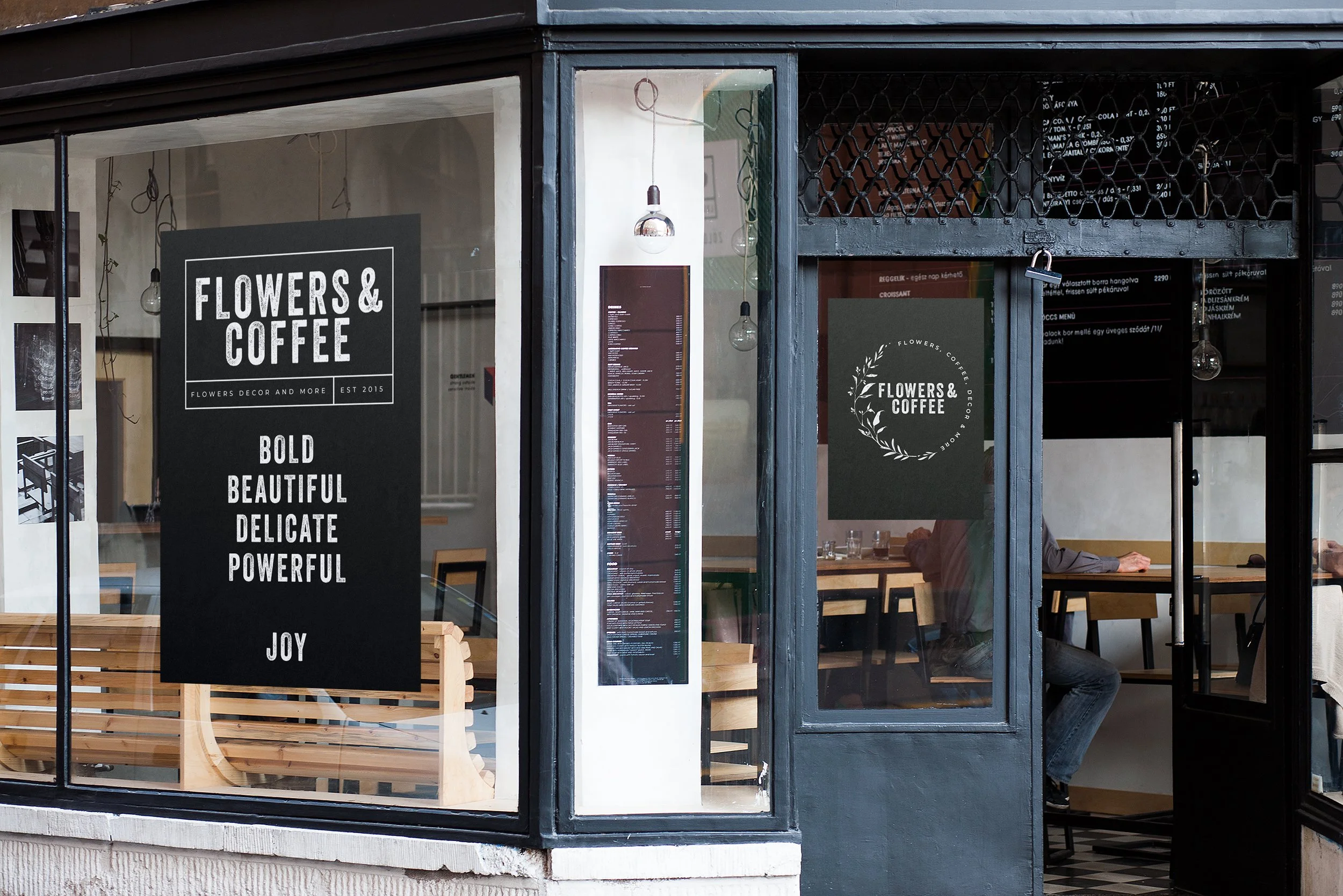Pretty clear, Flowers and coffee. We could have gone with all kinds of flowers growng out of coffee mugs but a bold black and white design felt much better with what Shelly was doing. Clean, bold, and so nice with menus - that black and white vibe.